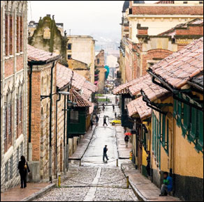 En Bogotá no existen las estaciones, llueve, hace calor o refresca sin avisar al viandante, que debe ser previsor antes de salir de casa. El ritmo es frenético: de tráfico, de gente, de comercios... todo bulle de vida. Sobre todo al acercarse al barrio de la Candelaria, la zona colonial y de mayor belleza de la ciudad.
