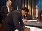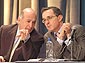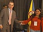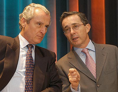 El presidente Álvaro Uribe Vélez dialoga con el ministro de Defensa, Jorge Alberto Uribe, durante el Consejo Comunal número 49 que reunió a los alcaldes y gobernadores actuales y electos de la Amazonía y la Orinoquía.