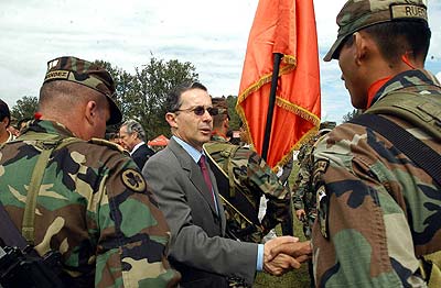 El presidente de la República, Álvaro Uribe Vélez, saluda a los soldados del Batallón de Alta Montaña, general Benjamín Herrera, activado hoy en la bota caucana.
