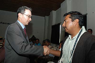 El presidente de la República, Álvaro Uribe Vélez, saluda a uno de los indigenas que participaron en el Consejo de Seguridad celebrado en Popayán.