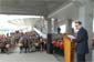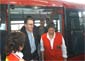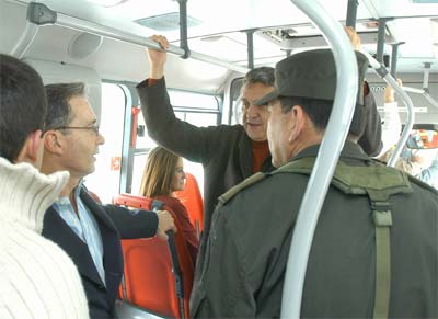 El presidente Álvaro Uribe Vélez dialoga con el alcalde electo de la ciudad, Luis Eduardo Garzón, en un recorrido en uno de los buses articulados, durante la puesta en marcha la nueva Troncal de Las Américas del Transmilenio de Bogotá. Foto: Fernando Ruíz - SNE
