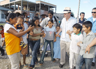 El Presidente de la República, Alvaro Uribe Vélez, recorre las calles de Puerto Guzman en compañia de los niños de la región.