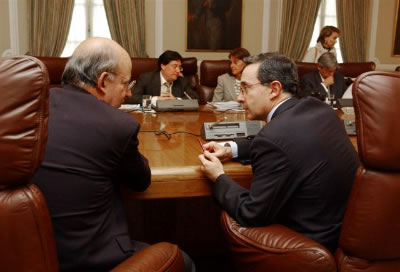 BOGOTÁ, MARZO 31 DE 2003. El Presidente de la República, Álvaro Uribe Veléz, con el Ministro de Hacienda, Roberto Junguito, durante el Consejo de Ministros