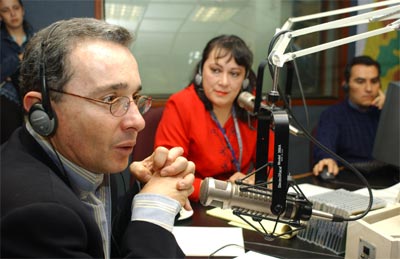 El presidente de la República Álvaro Uribe Vélez explica los 15 puntos del referendo al grupo de periodistas de la emisora Radio Reloj de la cadena Caracol.
