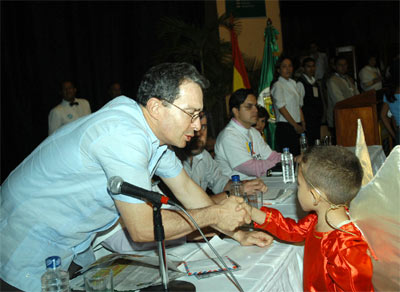 Durante la reunión con tenderos y microempresarios de la costa Caribe, el presidente de la República Álvaro Uribe Vélez tuvo tiempo para saludar a los niños presentes en el evento.