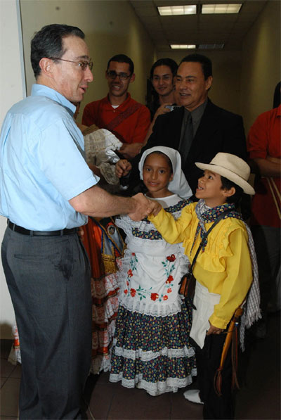 El presidente de la República Álvaro Uribe Vélez saluda a dos niños tolimenses durante la clausura del Consultorio Empresarial organizado por la Cámara de Comercio de Ibagué.