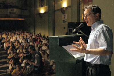 El presidente de la República, Álvaro Uribe Vélez, durante su intervención en el Teatro Tolima de Ibagué, donde se reunió con líderes del movimiento de Colombianos por el Referendo.