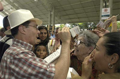 El presidente Álvaro Uribe Vélez, saluda a los más de dos mil promotores ambientales del Valle del Cauca, el Eje Cafetero y Tolima, reunidos en el Palacio de las Orquídeas de Cali.