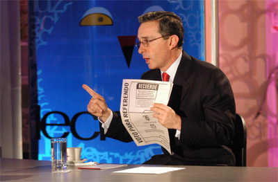 El presidente de la República Álvaro Uribe Vélez explica a los colombianos los quince puntos del referendo contra la politiquería y la corrupción en el programa Lechuza del Canal Caracol.