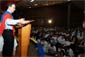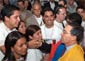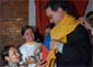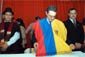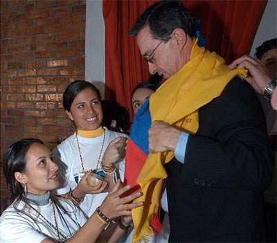 El presidente de la República, Álvaro Uribe Vélez, recibe un poncho con la bandera nacional durante el encuentro de Colombianos por el Referendo celebrado en la capital caucana.