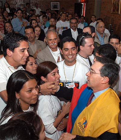 El presidente de la República, Álvaro Uribe Vélez, saluda a los asistentes al evento de Colombianos por el Referendo que tuvo una masiva de presencia de jóvenes del departamento del Cauca.