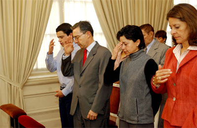 El presidente Álvaro Uribe Vélez, en compañía de su familia y de la ministra de Defensa Marta Lucía Ramírez de Rincón, asistieron a una misa en la Casa de Nariño antes de iniciar su marcha hacia la Plaza de Bolívar para votar el Referendo.
