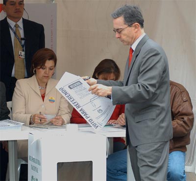El presidente de la República, Álvaro Uribe Vélez, abrió en la Plaza de Bolívar la jornada de votación por el Referendo.