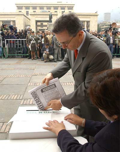 El presidente de la República, Álvaro Uribe Vélez, abrió en la Plaza de Bolívar la jornada de votación por el Referendo.