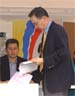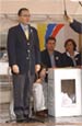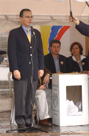 El presidente de la República, Álvaro Uribe Vélez, durante las declaraciones a los medios de comunicación minutos después de votar las elecciones de alcaldes y gobernadores en la Plaza de Bolívar.