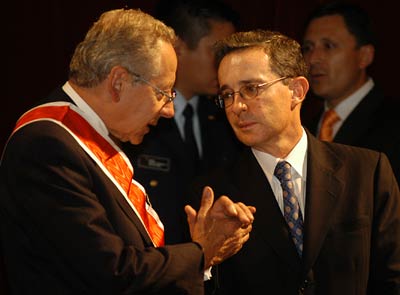 El presidente de la República, Álvaro Uribe Vélez, impuso la condecoración de la Orden Nacional al Mérito al rector de la Universidad Externado de Colombia, Fernando Hinestrosa.