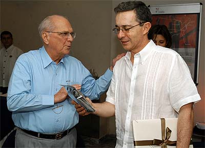 El presidente de la República, Álvaro Uribe Vélez, recibe como obsequio una bolsa de café por parte de su homólogo de Nicaragua, Enrique Bolaños Geyer, con quien sostuvo una reunión de trabajo en Cartagena.